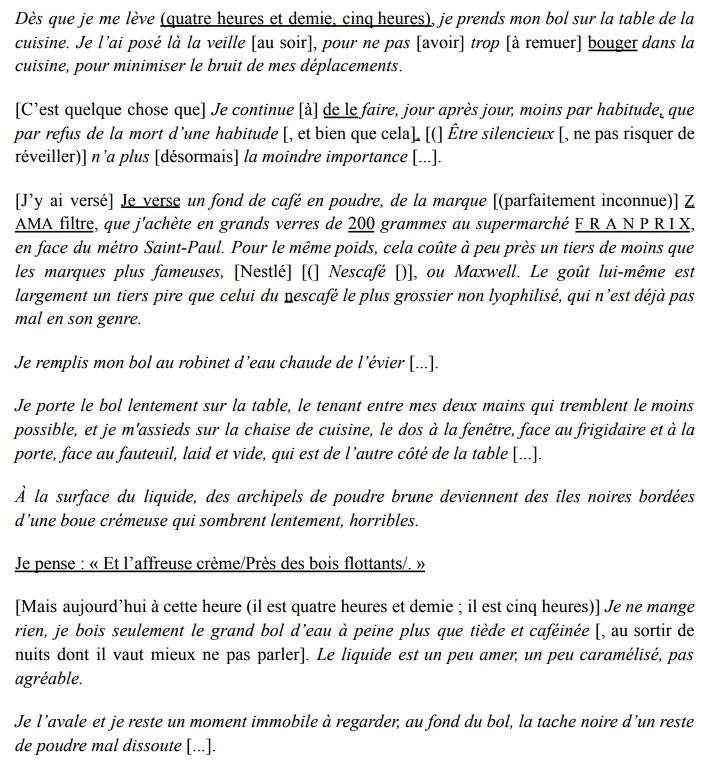 Il existe ainsi deux livres chez Wittgenstein : le Tractatus tel qu’il est écrit, et son double silencieux, discernable uniquement par ses contours. De manière analogue, il existe deux poèmes chez Roubaud. Le poème « Dès que je me lève » se présente en effet sous deux versions distinctes : l’une en prose, dans Le grand incendie de Londres, marquée par la répétition du rituel matinal ; l’autre en vers, dans Quelque chose noir. La version poétique procède par délétion de matière textuelle à partir de la version en prose. On pourrait alors être tenté d’y voir une version diminuée, et d’en conclure que le texte en prose lui serait supérieur, puisqu’il le contient intégralement.