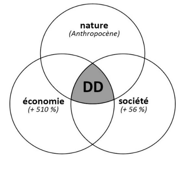 On peut voir 15 que la croissance de l’économie (« +510 % ») ainsi que la croissance de la société (« +56 % ») sont rapportées à l’anthropisation croissante des écosystèmes et de leur dégradation. Ce lien entre la croissance d’un côté et la dégradation de l’autre, ne peut être qu’un lien de causalité – qu’effacent le concept de développement durable.