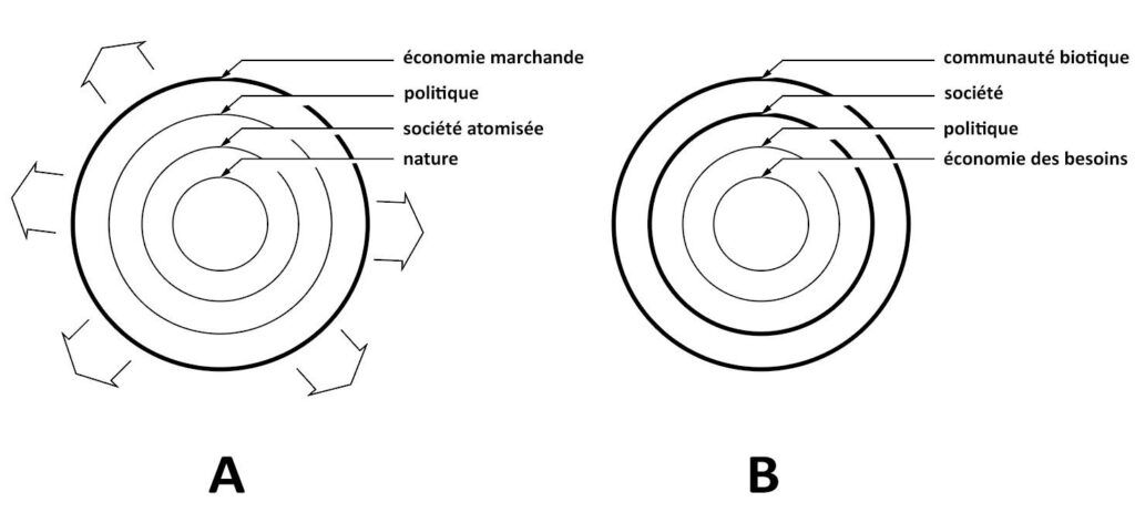 La partie « A » représente le système actuel (« dominant depuis les années 1970-1980 »). On y voit une prédominance de l’économie marchande ainsi qu’une subordination des autres sphères à cette dernière. La nature apparaît ainsi comme la servante des servantes. C’est sur son exploitation que se fonde la croissance toujours plus grande et incontrôlée de l’économie marchande.